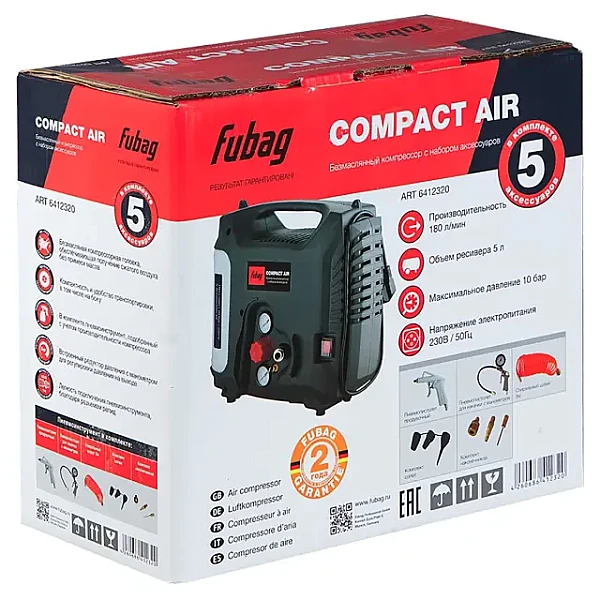 Купить Безмасляный компрессор FUBAG Compact Air + набор из 5 предметов в Красноярске легко — просто позвоните по телефону: 8-800-551-11-01