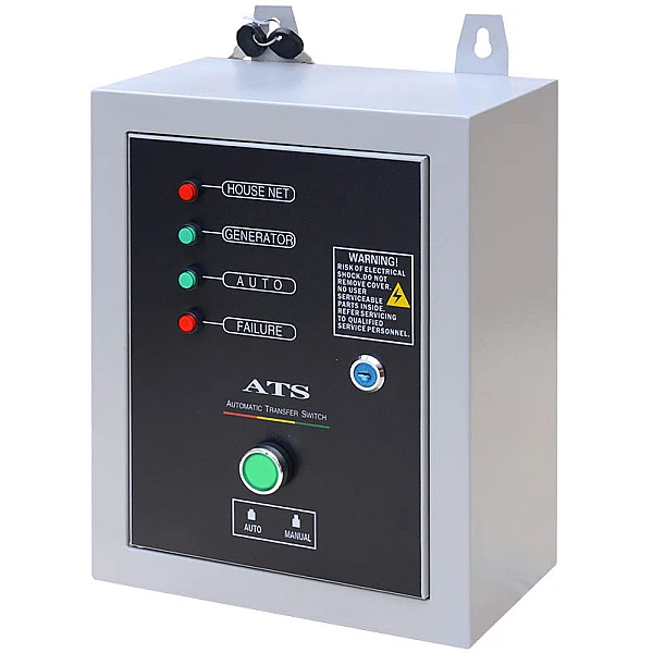 На передней панели блока расположены контрольные лампы, которые оповещают пользователя о текущем состоянии электросети, режиме работы генератора и неисправностях. Кроме того, отдельный индикатор позволяет быстро определить, как режим АВР активен - ручной или автоматический.