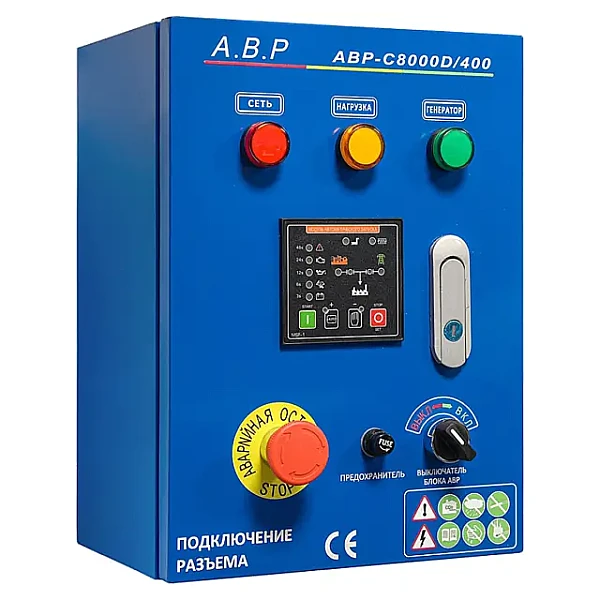 Блок АВР для дизельного генератора от 5 до 8 кВт/400 включает в себя систему автозапуска (автоматического ввода резервного электропитания). При появлении основного источника электропитания происходит отключение электростанции. Блок автоматического управления для контроля наличия напряжения в сети.