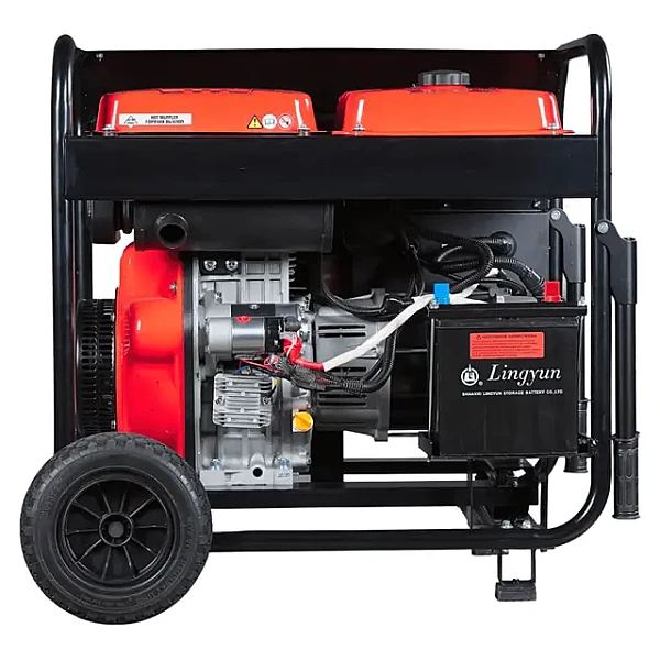 Электростартер обеспечивает быстрый и комфортный запуск двигателя, а предпусковой подогрев воздуха и свечей значительно упрощает запуск в холодную погоду, предотвращая проблемы с запуском в мороз. Транспортировочные колеса и удобные ручки делают перемещение генератора легким и простым.