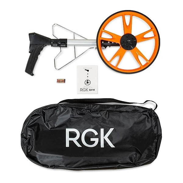 Телескопическая рукоятка курвиметра RGK Q318, на которой крепится дорожное колесо, позволяет установить длину штанги в зависимости от роста специалиста. Складная конструкция обеспечивает удобную транспортировку прибора в автомобиле или в общественном транспорте. Специальная подножка, предназначенная для удержания дорожного колеса в вертикальном положении