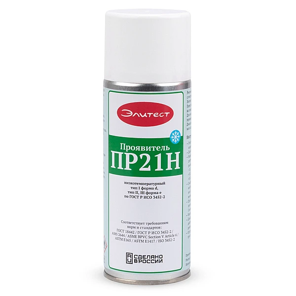 Проявитель Элитест ПР21Н изготавливается на основе растворителей. Создает на контролируемой поверхности однородный белый фон и вытягивает пенетрант, находящийся в полости дефекта. Является полным аналогом стандартного проявителя Элитест ПР21, адаптированным для использования при низких температурах: предельная температура контролируемого изделия может достигать −40 °C.